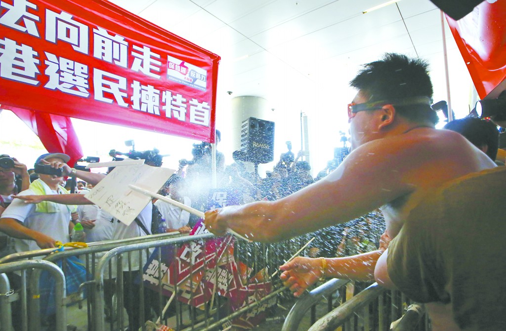 17日,在香港立法会外,一名反对政改的男子向支持派人群投掷标牌。