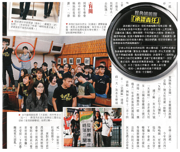 该报道又提到,另一名有份冲入校委会会议室,并站在会议桌上向一众校务委员破口大骂的中年女子,外号为“大家姐”,过去一年多次走上街头参与游行示威。她除了在去年12月铜锣湾“占领”区清场之前在现场演说,今年亦有参与“鸠呜团”行动和拿着“香港厨师联盟”的直幡现身“七一”游行。报道指,“香港厨师联盟”与反对派立法会议员梁耀忠的“街坊工友会”关系密切,“大家姐”亦曾参与街工的活动。
