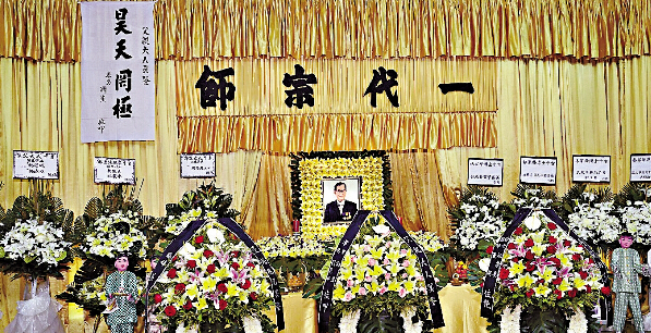 图:灵堂中央上方挂上“一代宗师”横匾,特首梁振英、林郑、刘江华送的花圈则放在声哥遗照右侧
