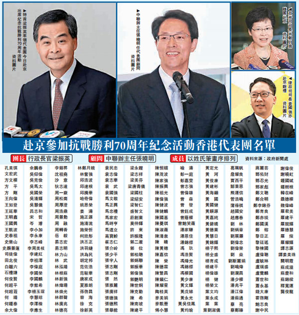 赴京参加抗战胜利70周年纪念活动的香港特别行政区代表团名单昨日出炉,代表团由行政长官梁振英担任团长,中联办主任张晓明担任顾问,政务司司长林郑月娥及律政司司长袁国强随行,财政司司长曾俊华则留港署理行政长官职务。终审法院首席法官马道立、行政会议召集人林焕光及立法会主席曾钰成均获邀,前任行政长官曾荫权与其太太亦在名单之上。
