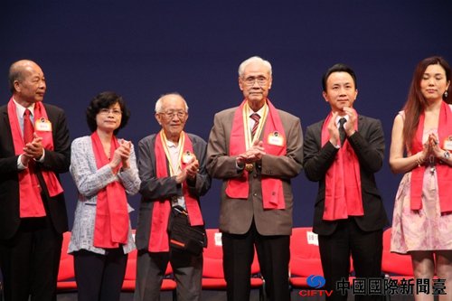 新界各界纪念抗战70周年大会举行,抗战老兵在大会上接受纪念奖章。(摄影:郭晓桐)