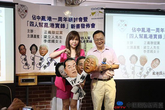 正义联盟党昨日于湾仔举办了“占中乱港一周年研讨会”暨“四人帮乱港实录”新书发布会。正义联盟党主席李偲嫣与资深传媒人梁立人在会上高举“乱港四人帮”李柱铭、陈方安生、陈日君和黎智英的纸板公仔,又播出一段十分钟的回顾影片,让参与市民重新感受“占中”时期的苦况。梁立人在会上表示,违法“占领”行动就如西方式“文化大革命”,为香港社会造成负面影响。