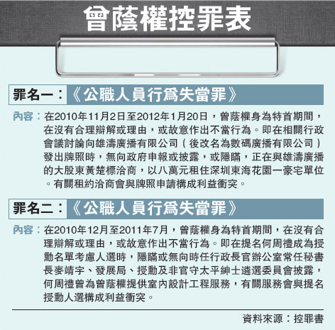 控罪指现年70岁的曾荫权,被控在2010年11月至2012年1月出任特首期间,两度未有向政府申报,与广播公司主要股东黄楚标、建筑设计师何周礼两人有利益冲突,先后以特首身份批出来自黄楚标公司的牌照和相关申请,以及提名何周礼授勋。