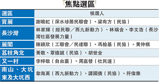 又一村选区亦是一大看点。深水埗区议会主席郭振华放弃竞逐连任,由自由党青年团主席李梓敬和社民连周嘉发对决。两位候选人同居于又一村,但政治、经济立场截然不同;李梓敬“中产味”较浓,自由党在九龙塘亦有地区基础,周嘉发言行激进出位,社民连则以基层形象论政,相比之下,李梓敬似乎更能赢得这个传统豪宅区选票。