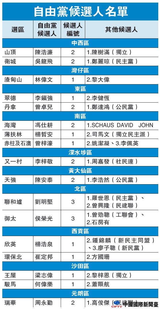 中国国际新闻台(www.ciftv.com)据:大公网11月20日讯 (记者龚学鸣)区议会选举在即,走中产专业路线的自由党共派出19人参选,平均年龄不足42岁,选区则主要集中在港岛和新界东,其中八人为首次参选。东区宝马山的邵家辉和九龙城区九龙塘的何显明,已自动当选。自由党主席钟国斌表示,选择参选的选区以中产人士住户为主,符合自由党的选民基础,期望议席数目会有所增长。