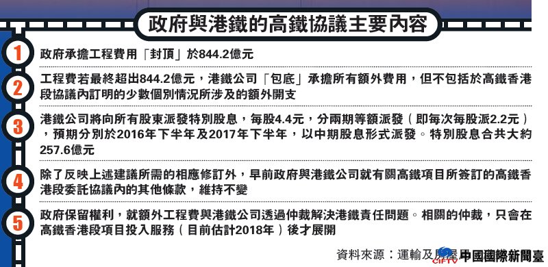 中国国际新闻台(www.ciftv.com)据:大公网12月1日讯 (记者陈卓康)特区政府与港铁公司就广深港高速铁路香港段(高铁)项目达成协议,双方昨日联合宣布,同意为高铁工程费“封顶”于844.2亿元,如再超支由港铁“包底”承担,政府将向立法会申请追加拨款196亿元。港铁同时宣布拟议向所有股东特别派息每股4.4元,身为大股东的政府获派息195.1亿元。但整套方案有“捆绑”条款,须于明年二月获港铁特别股东大会通过特别派息,立法会通过追加工程拨款,方能生效。政府指出,高铁已没有“Plan B”,方案若被拉倒,高铁工程将“烂尾”,势成“赔了夫人又折兵”。