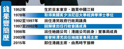 钱果丰于1998年加入地铁公司董事局,2003年接替苏泽光出任董事局主席至今,任内重大事件包括将军澳线通车、迪士尼线通车、“两铁合并”、西港岛线通车,以及前年揭发的广深港高铁香港段工程延误超支事件。他于席间提到,当年设立决定港铁每年票价加幅的“可加可减机制”,是为了减少由行政会议审批港铁加价的政治风险,没想到政治压力不减反增,暗批当年支持机制的反对派议员,如今又批评机制。