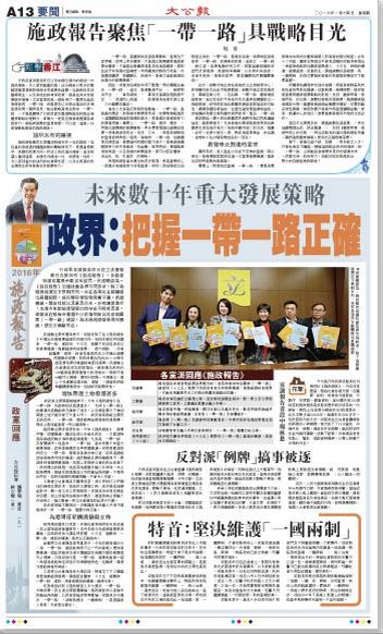 中国国际新闻台(www.ciftv.com)据大公网1月14日讯 行政长官梁振英昨日在立法会发表任内第四份《施政报告》,多个建制派政党表示欢迎和认同。民建联认为,《施政报告》回应社会各界不同诉求,除了为发展经济定下长期方向,亦在各项民生范畴提出具体细节。经民联形容报告务实平稳、把握机遇、关注社群以及惠及民生。亦有议员表示,本港今年的经济发展仍然存在不明朗因素,梁振英在报告中着墨不少于如何配合和参与国家“一带一路”建设,为本港经济发展寻找机遇,是往正确路向走。