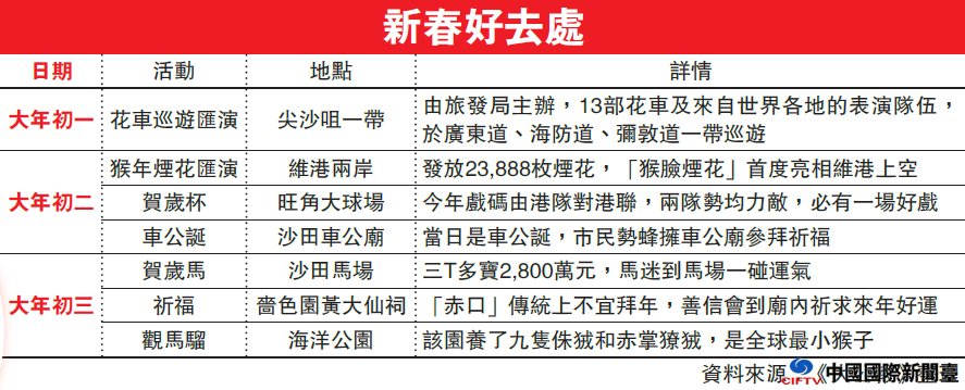 大年初一晚上的花车巡游,以及年初二维港的烟花汇演,警方下午起将港九多处实施封路及改道措施。配合烟花汇演,定期渡轮会维持服务至晚上7时30分,海事处会在初二下午2时至晚上11时在湾仔会展对出海面设立禁区,晚上7时至约9时15分在维港中部设立限制区,只准获批船只可以驶入,水警及海事处会针对船只超速及超载情况加强巡查。