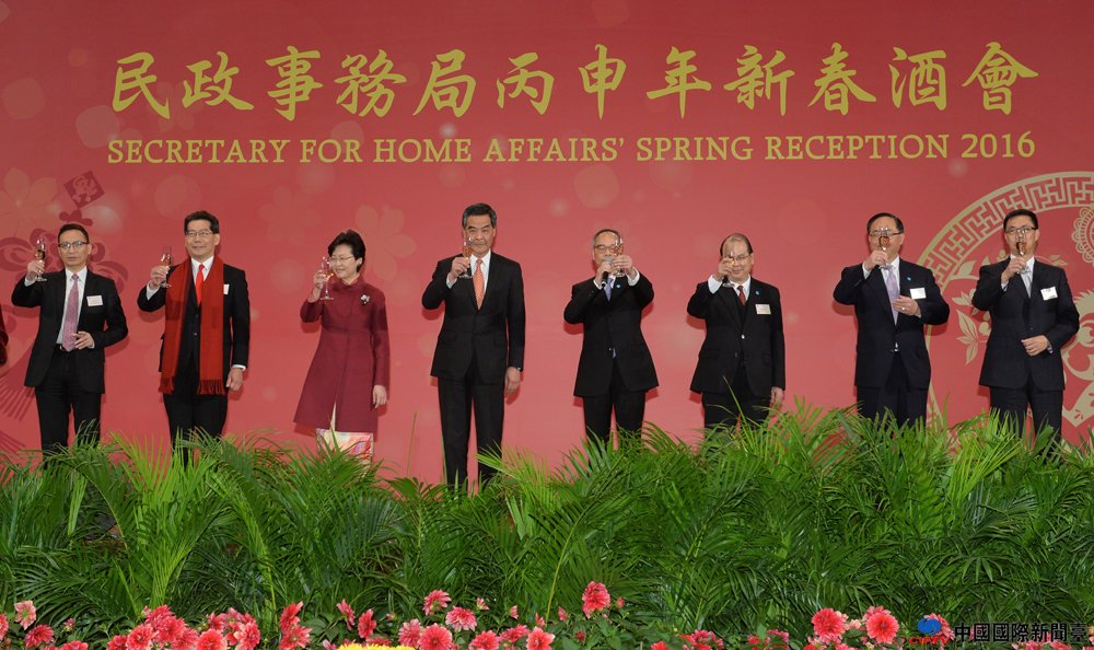 民政事务局昨日的新春酒会嘉宾云集,包括劳工及福利局局长张建宗、商务及经济发展局局长苏锦梁、创新及科技局局长杨伟雄、全港十八区区议员以及来自社会各界领袖,气氛热闹非凡。一众嘉宾在酒会上举杯同祝,香港和国家繁荣富强,港人身体健康。