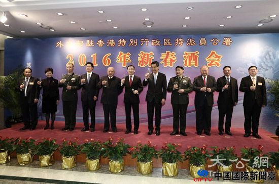 图:驻港特派员宋哲(中)在外交部驻港特派员公署举行2016年新春酒会。全国政协副主席董建华(左五)、特首梁振英(右五)、中联办主任张晓明(左四)等出席 大公报记者何嘉骏摄