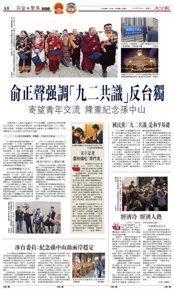 而在介绍2016年主要任务时,他表示将在坚持“九二共识”、反对“台独”的政治基础上,继续促进两岸关系和平发展,继续发展与台湾有关社会组织和团体的联繫交往,促进两岸经贸文化交流合作。