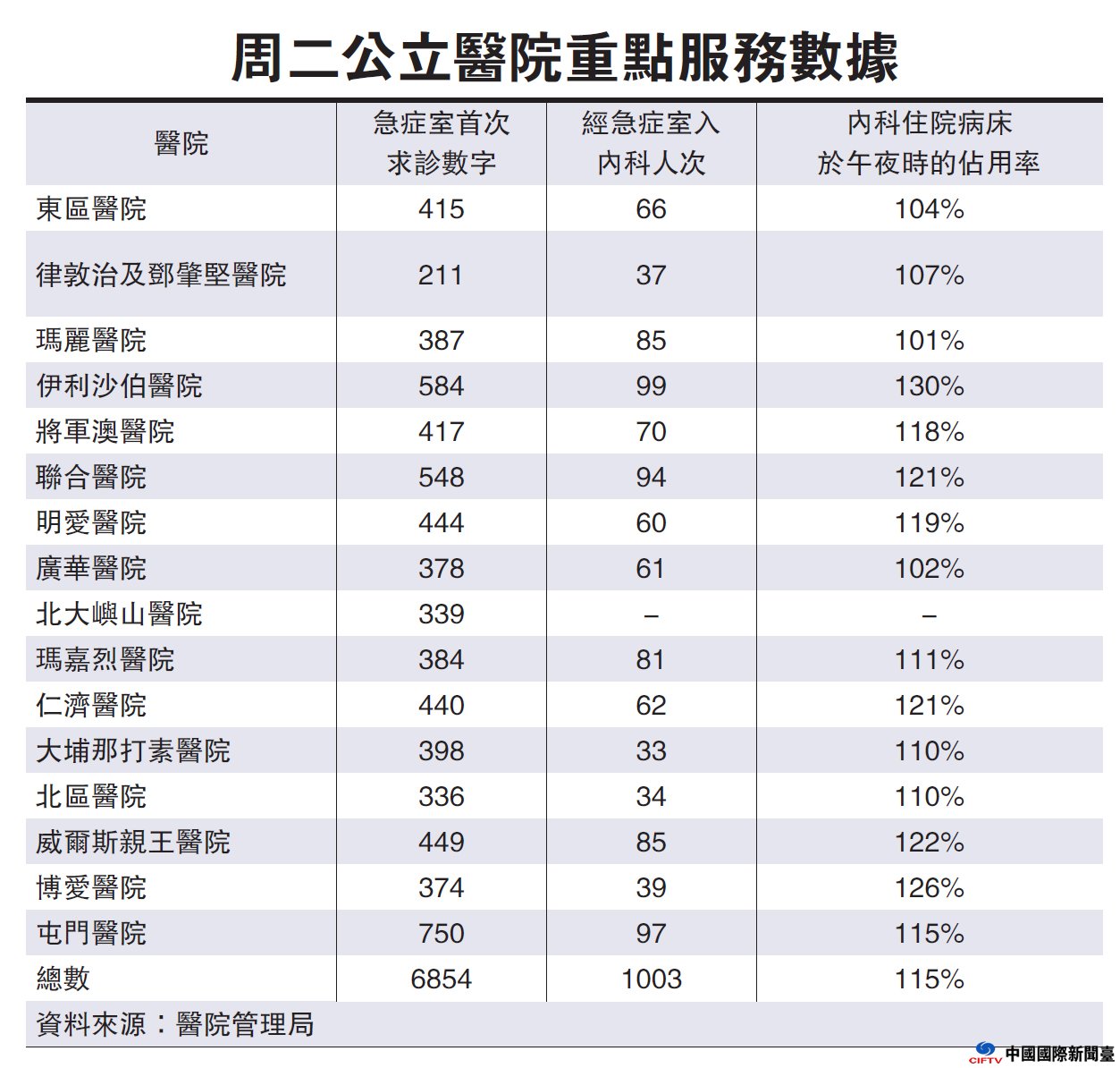 医管局最新数据显示,本周二全港公立医院求诊人数多达6854人次,已较前一日减少600人次,但需转介上房的病人并无明显下降,经急症室入内科留医的整体数字仍有1003人次,仅较前一日减少22人次。其中,屯门医院急症室的使用人次最多,有750人次,其次是伊利沙伯医院及联合医院。至于全港公立医院内科住院病床占用率高达115%,全部公院内科均出现迫爆情况,当中以伊利沙伯医院最严峻,占用率高达130%。