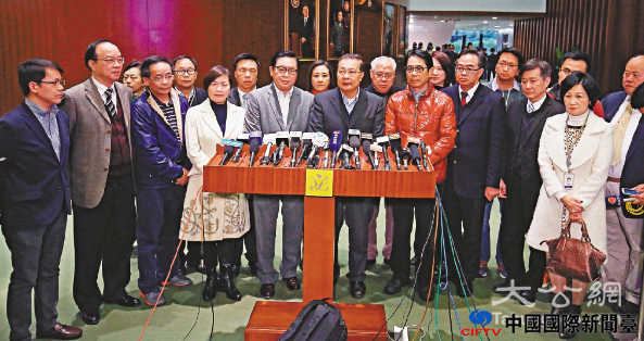 图:建制派议员在会后集体会见传媒,他们认为财委会代主席陈鑑林主持会议符合议事规则,可谓有节有理/大公报记者麦润田摄
