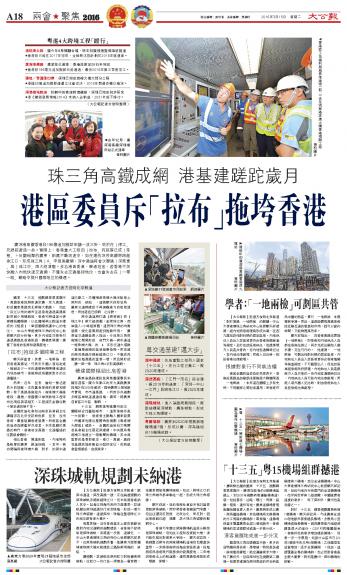 中国国际新闻台(www.ciftv.com)据大公网3月15日讯(记者方俊明)广深港高铁香港段196亿追加拨款申请一波三折,终于在“停工”死线前避过一劫。实际上,香港重大工程因“拉布”而延误已成“常态”。反观毗邻的广东,则处不断加速中,如在建的深茂高铁将跨越珠江口,形成珠三角“A”字型高铁网,深中通道将首次联通“深莞惠”与“珠江中”两大经济圈。多名港区委员、学者坦言,若香港不加快融入内地快速交通网,不仅失去交通枢纽地位,也会失去在“一带一路”战略中提升国际地位的机遇。