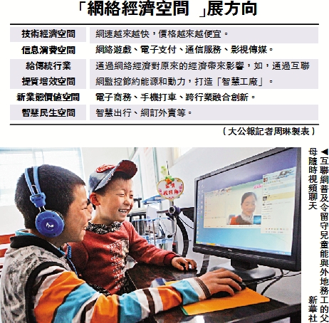 商务部研究院国际市场研究部副主任白明对大公报表示,专辟篇章“拓展网络经济空间”,是中国的五年规划首次以如此高规格筹划互联网发展。基于大数据、云计算、“互联网+”等概念的方兴未艾,在新的国家战略规划支持下,中国未来互联网经济将有更大的商机。