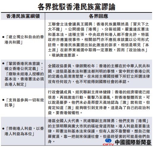 大公网3月29日讯(记者冼国强)新东补选后,“港独”分子斗激抢位。昨日首次有“港独”分子召开记者会宣布成立“香港民族党”,更肆无忌惮提出“建国”、“支持及参与一切有效抗争”等所谓“六大政纲”。该党声称成员约有30至50名,以大专生为主,但现身记者会的只有召集人陈浩天一人。陈浩天指,会积极派人参选立法会,又语带嘲讽称不认为范国威和毛孟静是“本土派”,意图划清界线。“香港民族党”首次亮相立即引发激进派“鬼打鬼”,同样走激进路线的社民连主席吴文远回应称,如果以撕裂香港和抗外的手段争取诉求,并不健康。