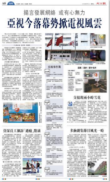 大公网4月1日讯(记者张月琪、叶汉亮)开台59年的亚洲电视,今日正式画上句号;紧接着,电讯盈科旗下的ViuTV、港台及电视广播有限公司将继续于免费电视中竞逐,亚视前主席邱德根之子邱达昌亦正申请免费电视牌照,相信随着“亚视永恒”的终结,本港将掀起新一轮“电视风云”。此外,虽然亚视投资者司荣彬早前扬言,亚视会继续注资发展为ott(over-the-top)网络电视,不过,亚视过往多次面临资金不足,现时发展方向仍成疑。