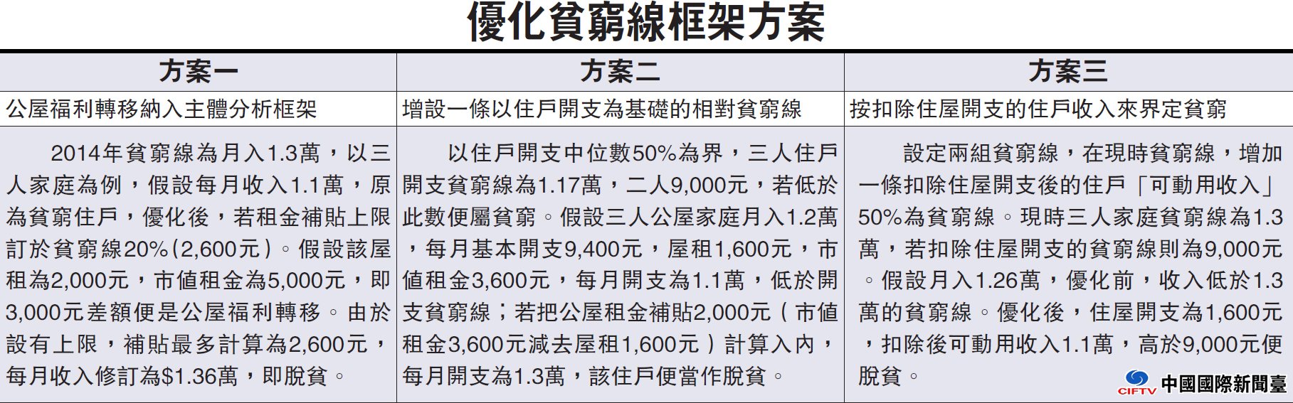 方案三则是参考英国做法,消息透露,是在现时贫穷线外,再增加一条扣除住屋开支后的住户可动用收入50%为贫穷线。现时三人家庭的贫穷线为1.3万元,若扣除住屋开支,另一组贫穷线则为9000元。由于劏房户等屋租负担较重,此方案能够有效分析私楼和公屋租户的生活情况,惟计算方法复杂,且租金变化大,不建议采用。