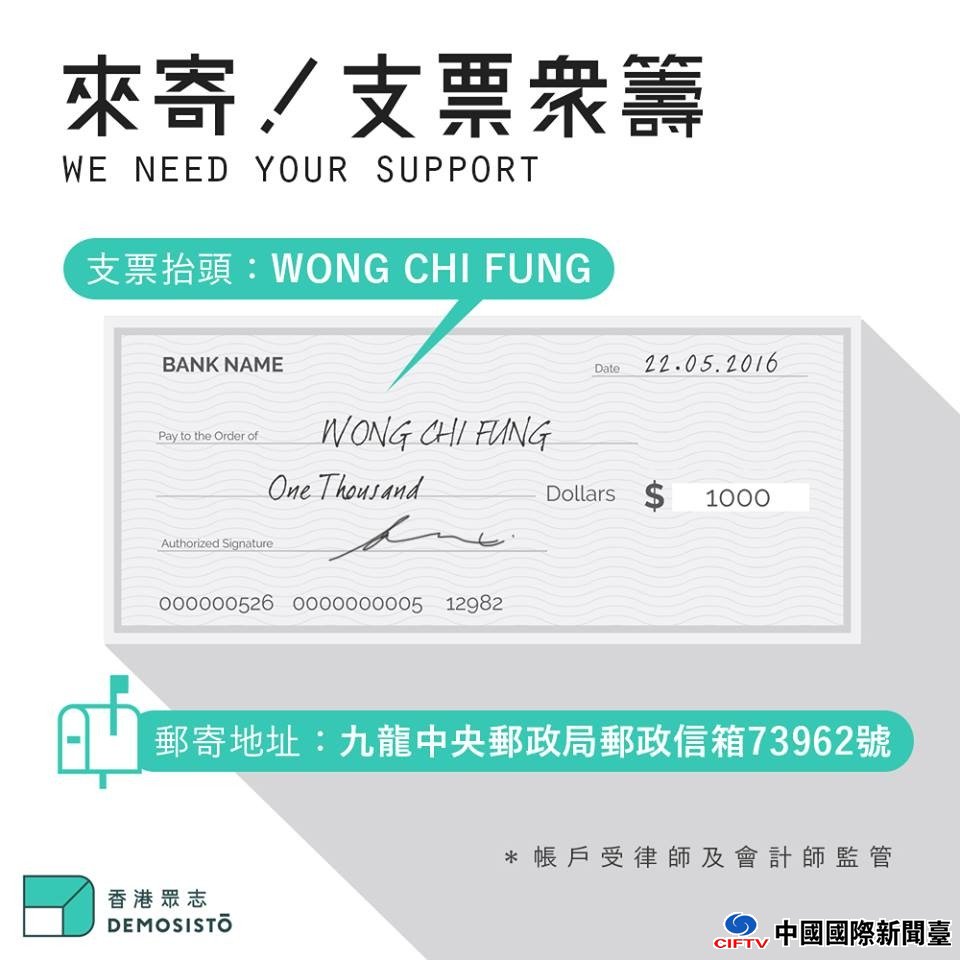 图:“香港众志”在Facebook发帖指明,划线支票抬头写WONGCHIFUNG网上图片