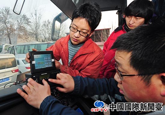 图:天津交通集团工作人员在客车安装北斗导航终端\资料图片