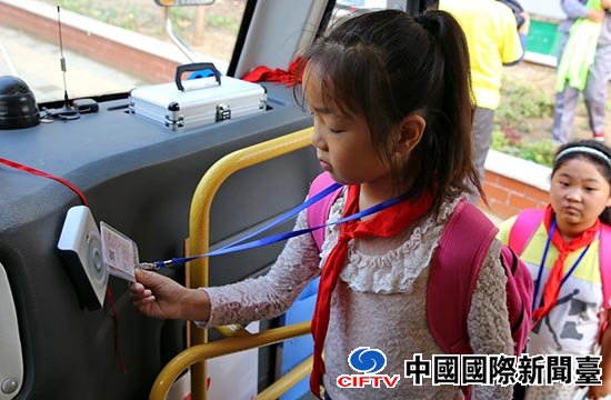 图:秦皇岛小学生在校车刷卡,北斗卫星导航监控系统会自动向家长发送信息\资料图片