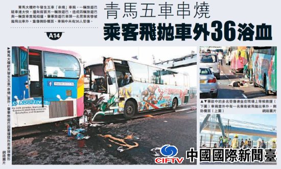 青马桥五车追尾 乘客飞抛车外36人受伤