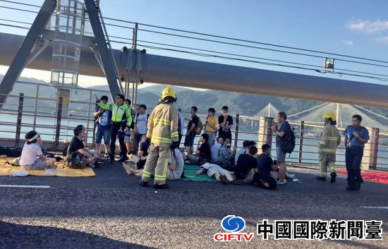 青马大桥五车“串烧”意外中,受伤较轻的男女坐在桥上等候救援。