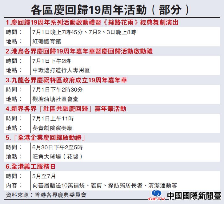 中国国际新闻台(www.ciftv.com)据大公网6月23日讯(记者李淇)为庆祝香港回归祖国19年,香港各界庆典委员会公布今年“七一”回归的系列周年活动,包括文艺晚会、义工服务,以及超过三千家商铺优惠等210多项活动陆续有来,预料将吸引逾30万市民参与活动。今年活动形式多元且深入社区,而为配合香港抓紧“一带一路”新机遇的概念,大会更特别邀请被誉为“中国舞剧之最”的《丝路花雨》经典舞剧,于七月一至三日晚上在红磡体育馆连演三场。