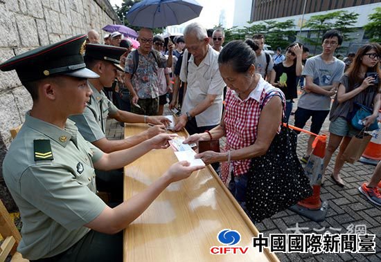 中国国际新闻台(www.ciftv.com)据大公网6月27日讯(记者孙凌奕)再过几日,香港将迎来回归祖国19周年的日子,解放军驻港部队将于七月一日和二日举行军营开放日。昨日上午,驻港部队在六个军营门口免费派发2.6万张门票,虽然天气炎热,但市民希望一睹军营风采的心情非常热切。有家住大埔的市民凌晨四时便搭通宵巴士前来排队取票,亦有市民已连续十余年参与军营开放日的活动,还有人表示看到国家军事强大,“作为中国人很骄傲”。