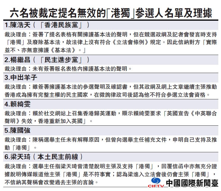 六名“港独”提名无效 政界:选举主任决定合法理情