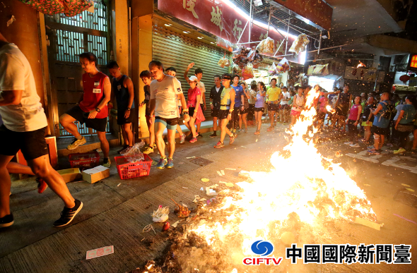 图:“盂兰跑”在中上环举行,跑手经过时,街坊正在烧衣/大公报记者麦润田摄