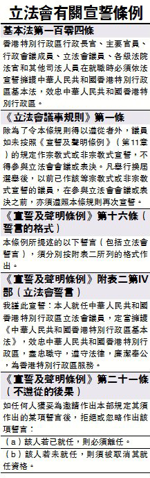 港大法律学系教授陈弘毅认为,以往法庭已就立法会议员宣誓时作出裁决,订出宣誓要求,议员需要根据法例的誓言宣誓,不能有任何变更,包括增多或减少。