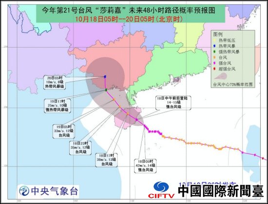 今年第21号台风“莎莉嘉”(强台风级)的中心今天(18日)早晨5点钟位于海南省万宁市东偏南方大约100公里的南海北部海面上,就是北纬18.5度、东经111.3度,中心附近最大风力有14级(42米/秒),中心最低气压955百帕,七级风圈半径为180~260公里,十级风圈半径为80公里,十二级风圈半径为40公里。