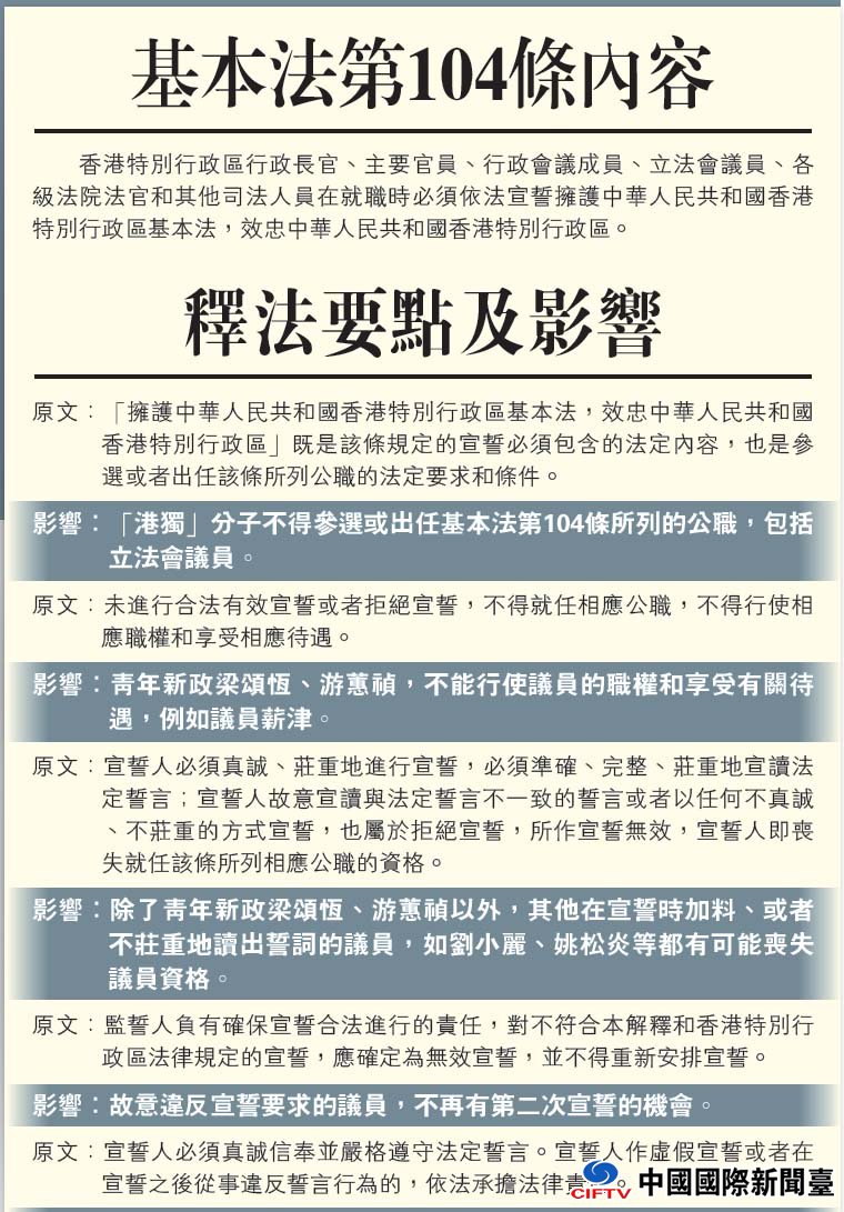 《解释》又指,基本法第104条所规定的宣誓,是该条所列公职人员对中华人民共和国及其香港特别行政区作出的法律承诺,具有法律约束力。宣誓人必须真诚信奉并严格遵守法定誓言,宣誓人作虚假宣誓或在宣誓之后从事违反誓言行为的,依法承担法律责任。