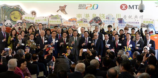 港铁昨日在海洋公园站举行南港岛线启用庆祝典礼,数百嘉宾获邀出席,行政长官梁振英、运输及房屋局局长张炳良、港铁主席马时亨等主持启用仪式。梁振英致辞时称,铁路是理想的公共交通工具,自己是当之无愧的铁路服务“粉丝”。南港岛线落成是南区居民的喜事,因以往居民出行,主要依靠陆路交通,若香港仔隧道挤塞,对居民出行有影响。南港岛线下星期开通后,由海怡半岛前往金钟只需11分钟,比现时所需的15至45分钟大大缩短。