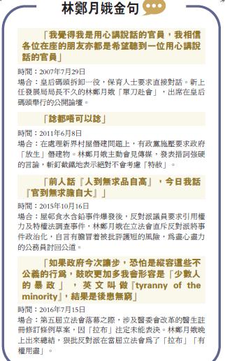 【大公报讯】记者吴维思报道:加入政府36年的政务司司长林郑月娥,素来作风“硬净”,敢于处理棘手及争议问题,且立场坚决果断。担任发展局局长期间,她处理了中环皇后码头拆迁、新界村屋僭建多起争议事件,2012年上任政务司司长后力推政改方案咨询。林郑月娥亦敢于在争议中力挺公务员团队,包括直斥“泛民”政治化屋邨铅水事件等。外界普遍认为,林郑月娥具有较强的管治能力及驾驭复杂局势的能力。
