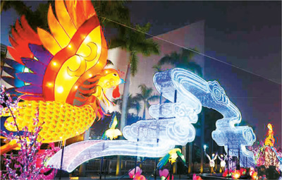 在现场,观众们可以看到两只绚丽夺目的凤和凰分别位于左右两水池的各一边,相互对望,尾巴上装有5种颜色不同的发光二极管彩灯,一只凰站立在桃花走马灯上正在求爱,一只凤则以翱翔姿态追寻所爱。一个大型祥云拱门将两边的灯饰相连,人们可从蓝白两色相间的祥云拱门下方通过,体验节日的浪漫和欢乐。