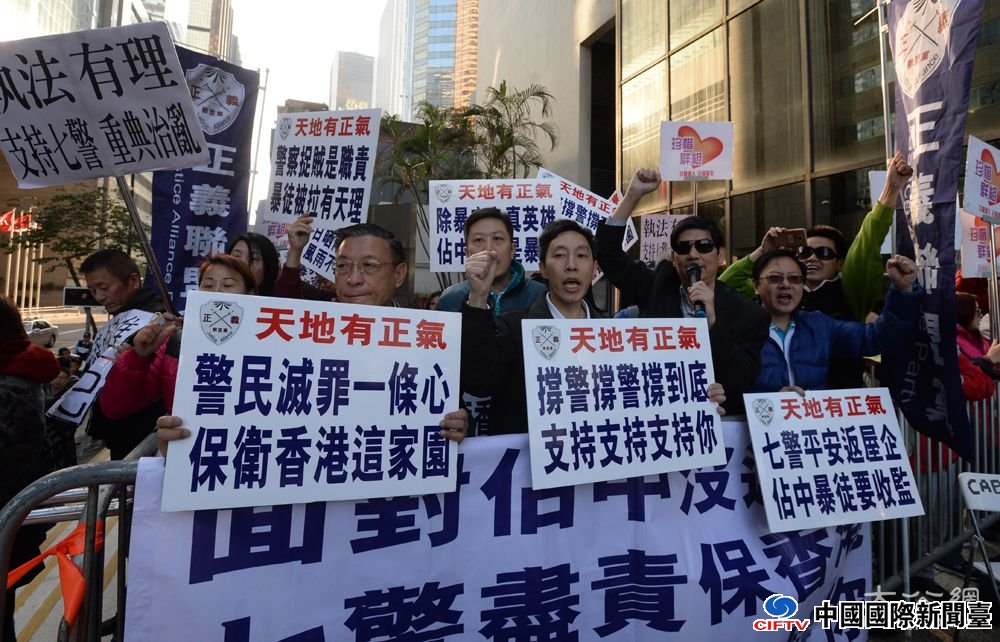 图:正义联盟、珍惜群组等团体在庭外高叫口号,力撑七警/大公报记者 林良坚摄