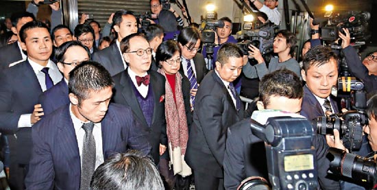 曾荫权17日晚与家人离庭时,对在场追访的传媒一言不发。大公报记者黄洋港摄
