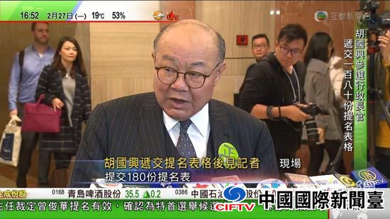 大公网2月27日讯 香港行政长官参选人胡国兴今日(2月27日)下午到湾仔选举事务处递交提名表,成为继曾俊华后第二位报名参选人士。胡国兴表示,一共递交了180份提名,咨询过选委意见后,退回6份。