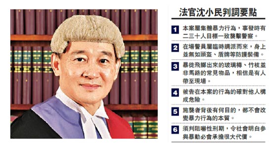 法官沈小民判词指出,暴动罪的量刑考虑是基于暴力水平、事态规模、参与人数多寡、是否有预谋等因素。被告在本案中,主要以玻璃樽、竹枝作武器掷向警方。沈官强调,单一飞坠而来的玻璃樽、竹枝或不会有严重伤害,暴力水平亦未必严重至需判处入狱,但现场的客观情况,多达20至30人有同一目标地投掷玻璃樽、竹枝,明显是要令防线上的警员受伤,事件的暴力水平因而大为提升。