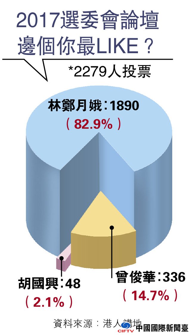 大公网3月21日讯(记者龚学鸣)网媒《港人讲地》昨日进行民意调查,让网民表达对于各个特首候选人于前晚2017选委会论坛的表现。截至昨日中午为止,共有2279名网民投票支持,其中林郑月娥得到1890名网民支持,占82.9%,大幅抛离只有14.7%支持度的曾俊华,曾只有336名网民支持。胡国兴则排最尾,仅得48票,占2.1%。