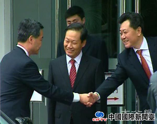 梁振英当选第四任香港行政长官人选翌日拜访香港中联办,时任香港中联办主任彭清华与梁振英会面。