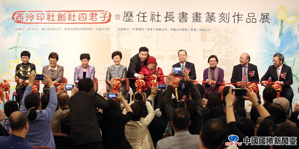 “西泠印社创社四君子暨歷任社长书画篆刻作品展”昨日在香港中央图书馆地下展览馆开幕,至本月13日免费向公众开放,这亦是获誉为“天下第一名社”的西泠印社文物典藏首次在港展出。担任主礼嘉宾的候任行政长官林郑月娥表示,中国传统文化的传播是香港文化不可或缺的组成部分,非常欢迎西泠印社能够在香港回归祖国20周年之际前来展览,为香港市民带来美好的艺术享受。西泠印社社长、国学泰斗饶宗颐教授在致辞中指,21世纪是中国文艺復兴的时代,他对此充满信心。\大公报记者 朱晋科