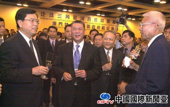 图:张德江(左)2004年出席“泛珠江三角洲区域合作与发展论坛”,在欢迎晚宴上与各界亲切交流\资料图片