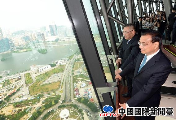 图:国务院总理李克强去年视察澳门,在特首崔世安陪同下,登上旅游塔了解澳门的发展情况\资料图片