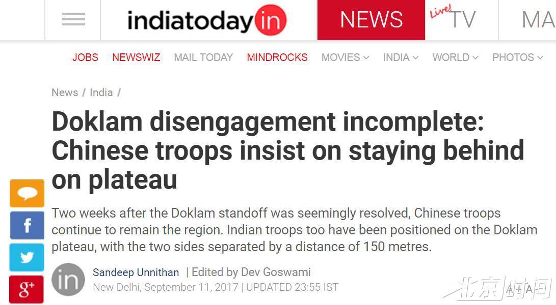 《今日印度》12日报道称,印中洞朗对峙结束,问题看似得到解决,但中国军队依然驻守在洞朗地区,印度军队也没有远离,两军目前各有数量不详的人员留在这一地区,各自相距150米。此外,解放军还在山脊上修建了掩体,这引发两国再次对峙的担忧。